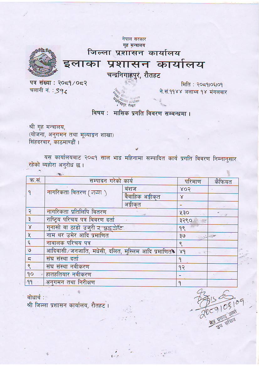 भाद्र महिनाको मासिक प्रगति विवरण ।