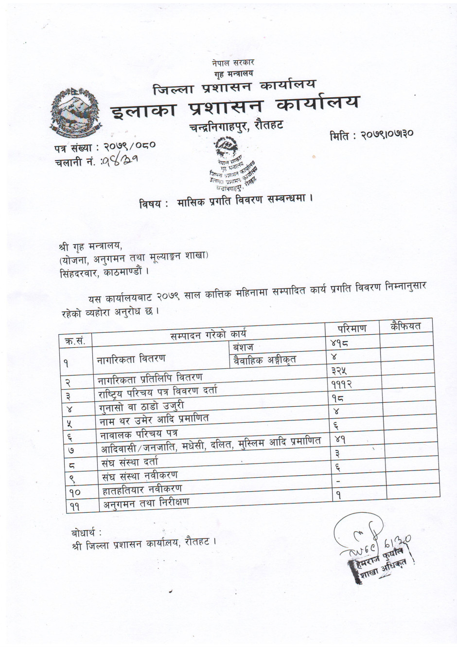 २०८२ साल मङ्सीर महिनाको प्रगति विववरण