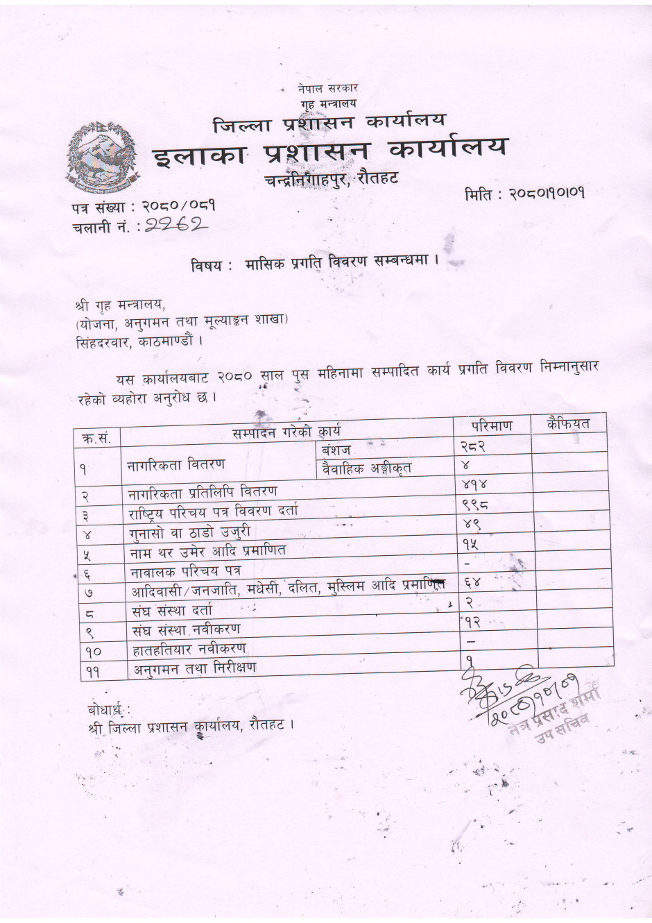 पुस महिनामा मासिक प्रगति विवरण